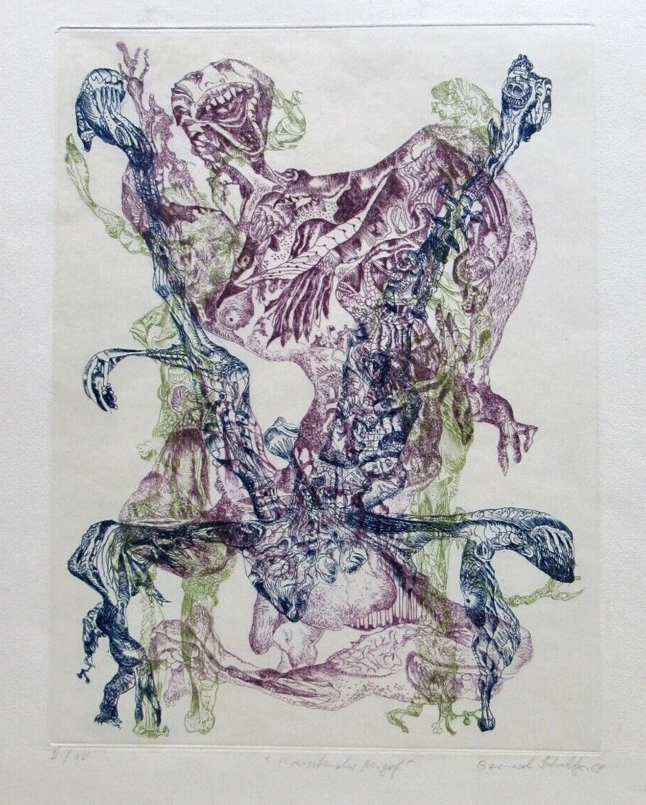 Bernard Schultze, 1915-2005 "Kreischender Migof" (Screaming Migof) Color etching, 1969, 23x18 in. Bernard Schultze was a German abstract painter who co-founded the Quadriga group of artists. His work can be found in a number of museums including: |